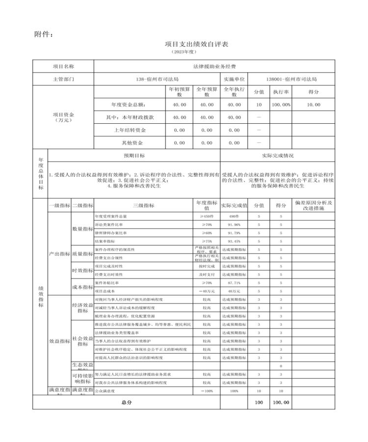 法律援助项目绩效自评综述:根据年初设定的绩效目标,项目绩效自评得分为100分。全年预算数为40万元,执行数为40万元,完成预算的100.00%。项目绩效目标完成情况:一是受理案件450件;二是诉讼类案件占比97.5%;三是律所律师办案占比97.1%。发现的主要问题及原因:一是未建立科学的项目绩效评价体系;二是项目责任划分不够到位。下一步改进措施:一是按照财政支出绩效管理要求,建立科学的项目绩效评价体系,不断提高财政资金使用管理的水平和效益;二是完善项目责任制,业务科室为项目实施责任科室,应加强与办公室的沟通协调和项目实施,定期做好预算执行分析。