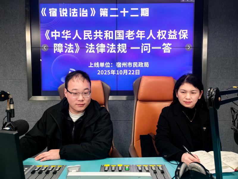 10月15日,《宿说法治》广播融媒体直播节目邀请了宿州市老龄工作委员会办公室综合科科长段志倩,宿州市民政局老龄事业科(养老服务科)负责人尹自强与大家就“《中华人民共和国老年人权益保障法》解读”这一主题进行交流。