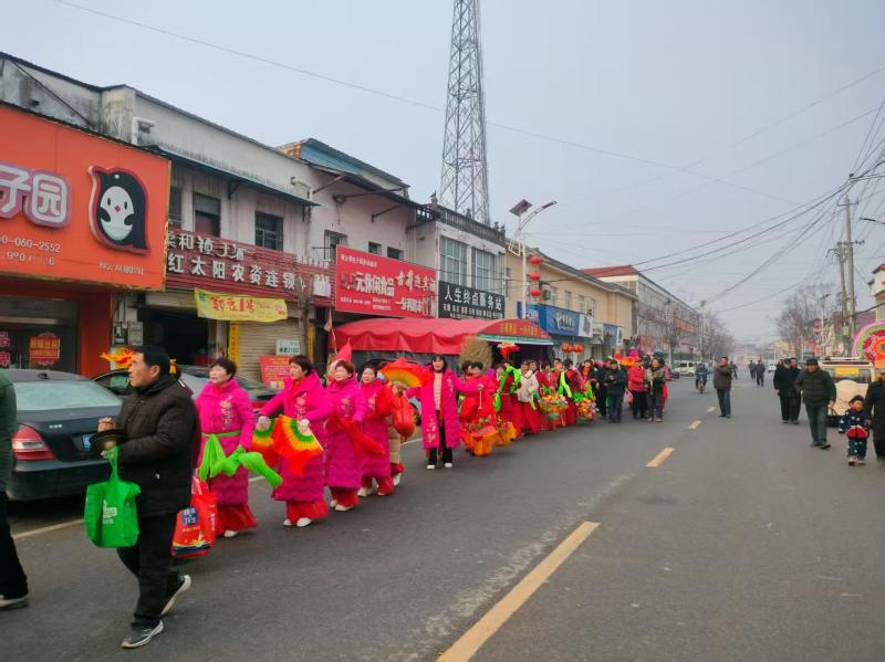 在民法典一条街开展民俗踩街活动,近100多人自西向东,花挑、旱船领头队,钱杆、大鼓紧随其后,极大彰显了民俗文化魅力。同时,在杨集村部,“元宵节--法治灯谜”专场喜庆上演。