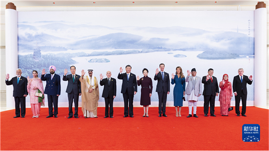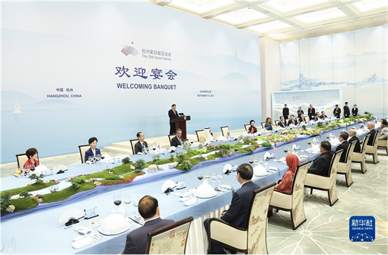 9月23日中午,国家主席习近平和夫人彭丽媛在浙江省杭州市西子宾馆举行宴会,欢迎来华出席杭州第19届亚洲运动会开幕式的国际贵宾。