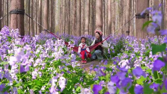 在江苏金湖水上森林公园,水杉林间的100多亩二月兰盛开,吸引众多游客春游踏青,感受春日浪漫。