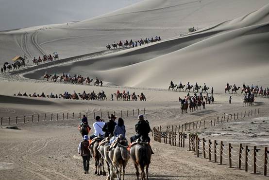 2025年6月2日,游客在甘肃省敦煌市鸣沙山月牙泉景区游览。新华社发(张晓亮 摄)