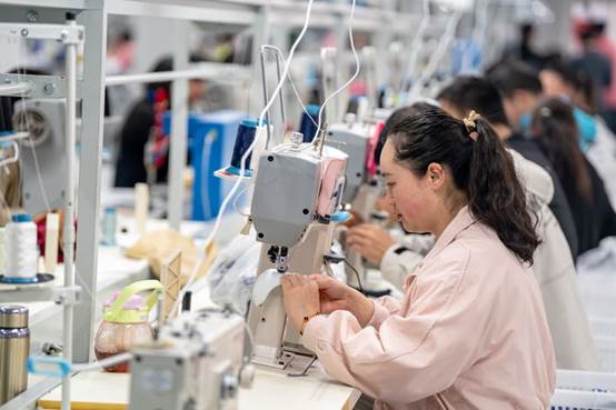 2025年5月13日,云南省昭通市镇雄县居民在镇雄纺织服装产业园鞋服加工车间工作。新华社记者 胡超 摄