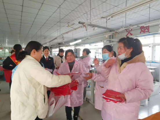 3月3日下午,县妇联、县检察院普法志愿者到朱楼镇梁寨村咏梅服装有限公司,向车间女职工普及法律知识。